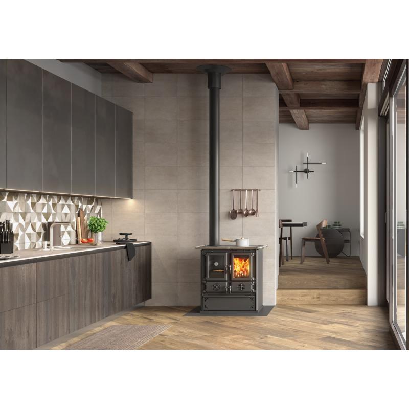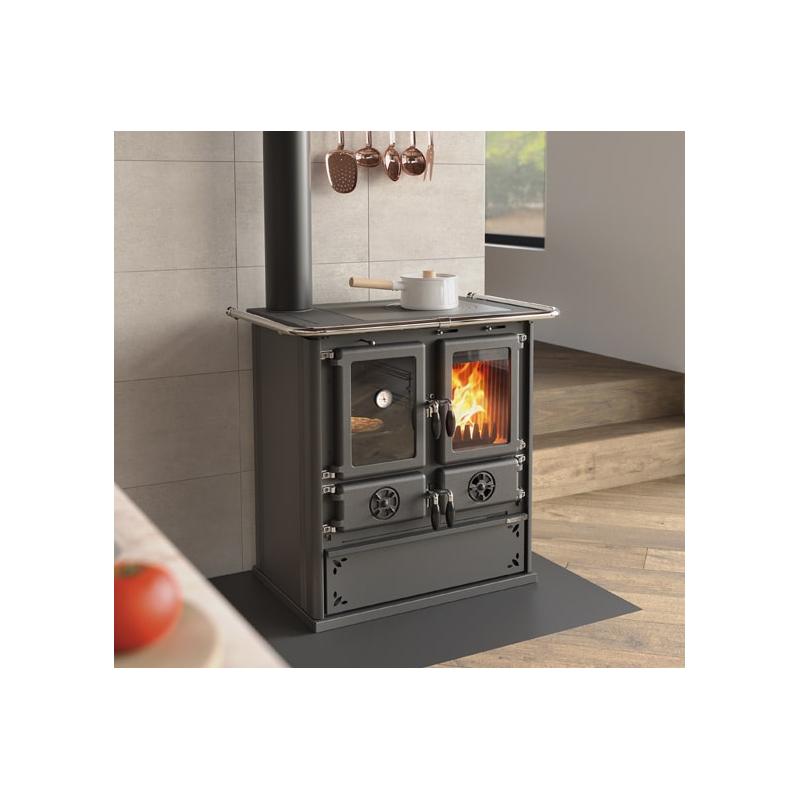 La cuisinière à bois Rosetta Sinistra 5.0 Steel de la marque LA NORDICA accepte des bûches jusqu’à 33 cm. L’intérêt principal d’une cuisinière à bois est d’assurer une fonction de cuisson mais aussi de chauffer votre maison. Cette cuisinière à bois vous permettra de chauffer jusqu’à 226 m3 et de profiter d’une chaleur confortable tout en cuisinant car elle est équipé d’un four de 28 litres.