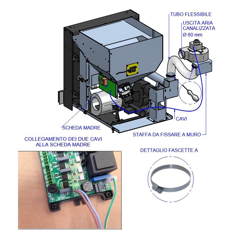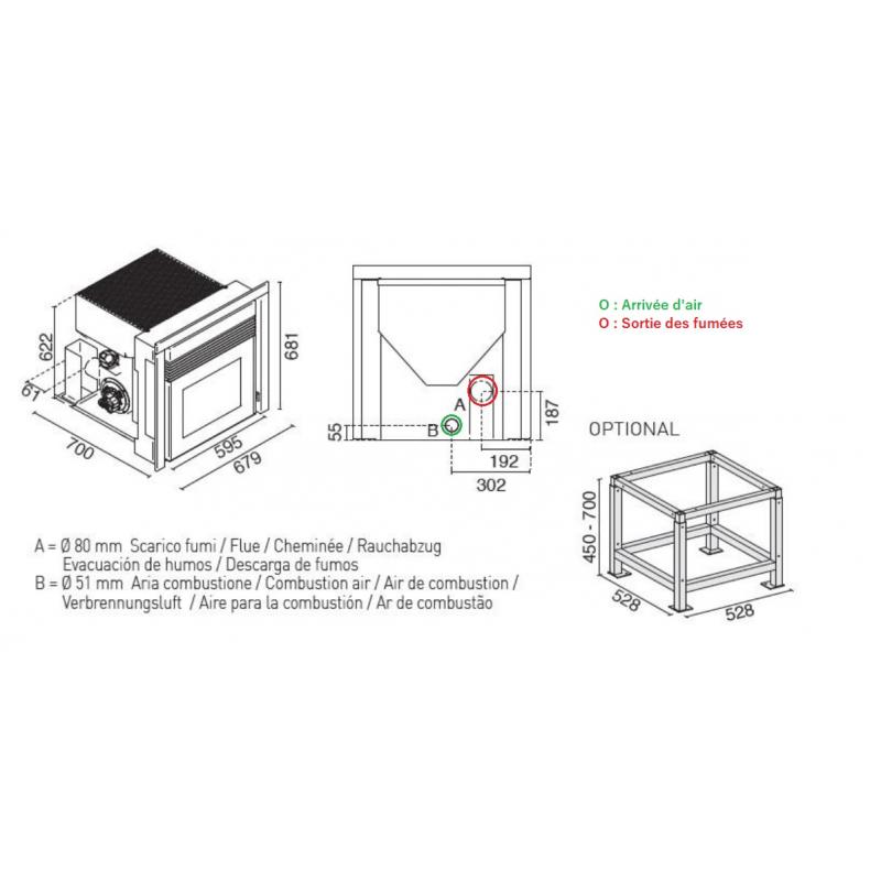 Schéma explicatif de l’insert à granules ventilé canalisable EVA CALOR Andrea 8.5 kw