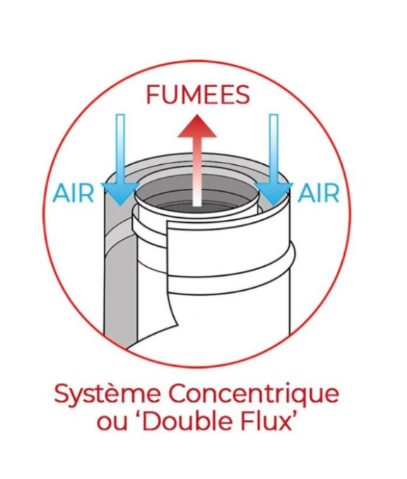 Le conduit est dit double flux ou concentrique. C’est à dire qu’il gère le flux d’air ET le flux de fumées.