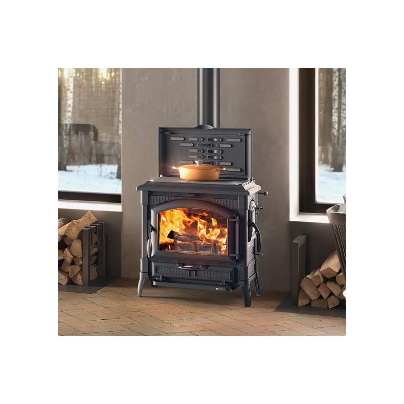 Le poêle à bois Isotta con cerchi Evo de la marque La Nordica vous offrira la possibilité de chauffer votre maison jusqu’à 338 m3. Le revêtement du poêle à bois Isotta con cherchi Evo est entièrement fait de fonte ce qui assure au produit d’une grande longévité et résistance aux chocs. Gardez tous vos plats au chaud et cuisiniez grâce à la plaque situé au dessus du foyer.