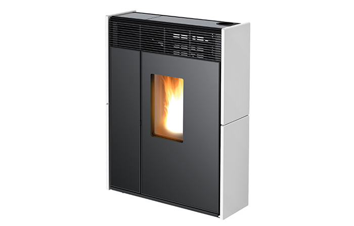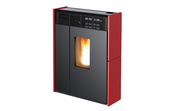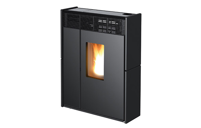 La façade comprend une porte en double vitrage et une grille de ventilation en acier peint. Le couvercle s’ouvre avec un bouton pour le chargement des granulés. Les côtés sont en céramique aux différents coloris noir, blanc, bordeau ou en pierre ollaire Serpentino.