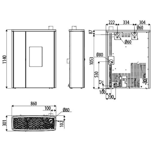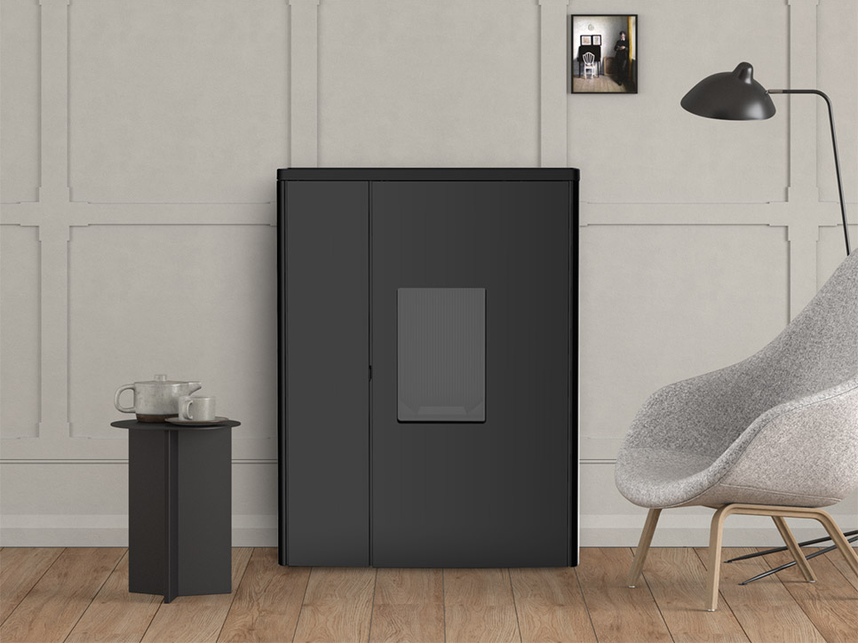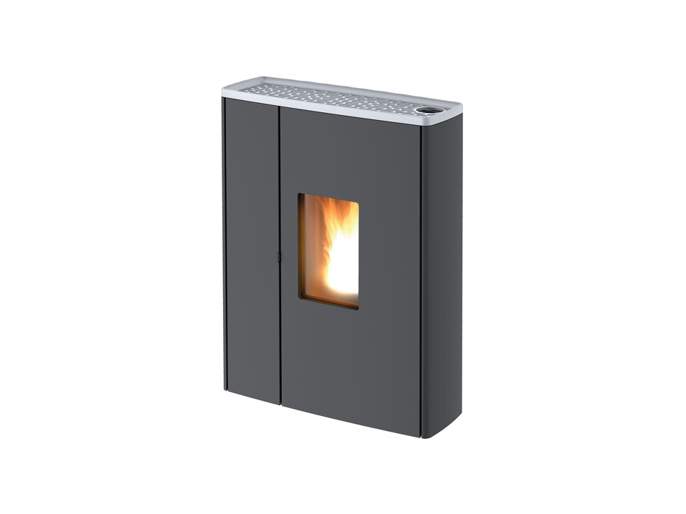 La façade au style extrêmement épuré, comprend le foyer sur la droite et, sur la gauche, une porte ouvrable pour accéder au réservoir à pellets. Le couvercle est caractérisé par un dessin géométrique. Il existe en fonte et acier peint Black ou en fonte finition aluminium.