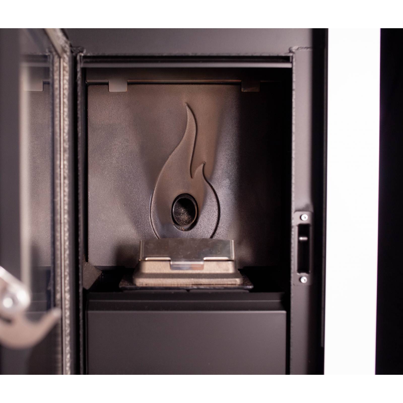 Côté technique : le poêle est doté de l’électronique Micronova, réputée sur le marché pour sa fiabilité et sa simplicité d’utilisation. Son écran de programmation rétro-éclairé se compose de 6 boutons fonctionnels et intuitifs. Côté finitions, la plaque de fond du foyer, le cendrier et le creuset sont conçus en fonte. Un matériau de qualité, reconnu pour sa robustesse, mais aussi pour le fonctionnement plus silencieux qu’il offre lorsque les granulés tombent dans le cendrier. Son ventilateur frontal le distingue des modèles concurrents classiques. Cette conception offre un vrai plus pour une diffusion uniforme de la chaleur dans le salon.