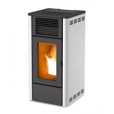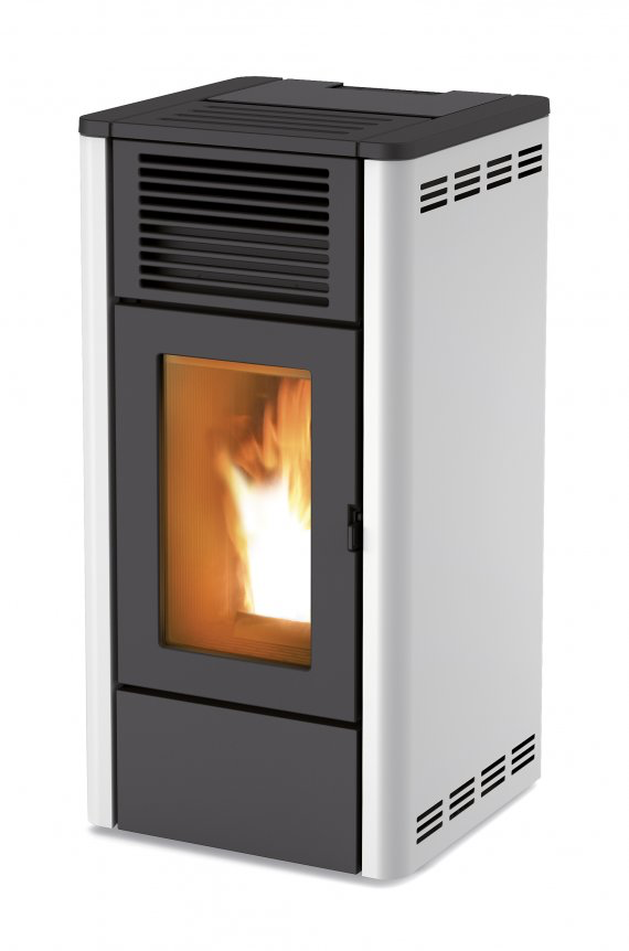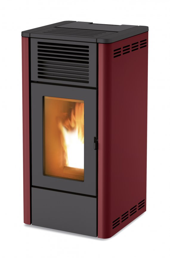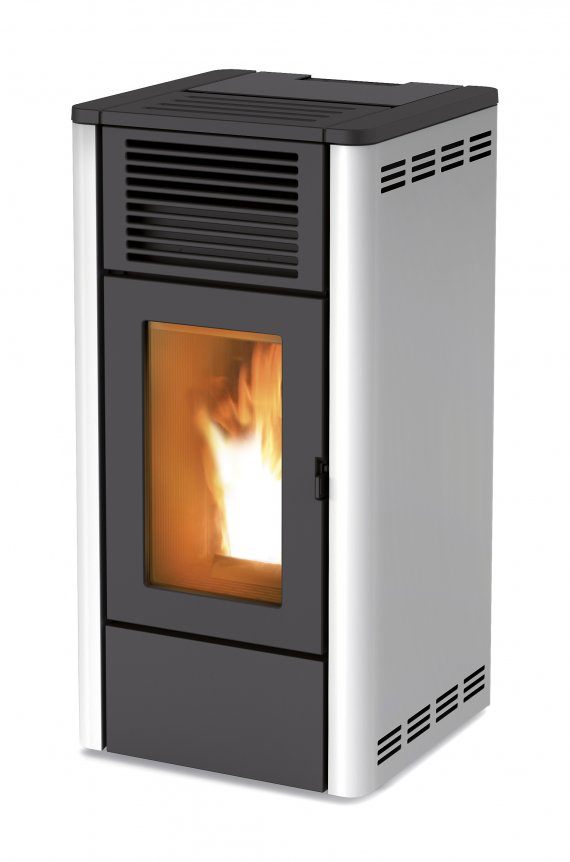Poêle à granulés de forme moderne, en acier et en fonte. Deux revêtements possibles : en acier peint (blanc, argent, bordeaux, noir) ou en aluminium.
