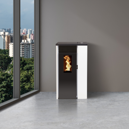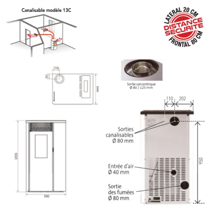 Les sorties des fumées se font par le dessus ou à l’arrière. La sortie sur le dessus est concentrique et permet de mettre le poêle contre le mur (avec un mur anti feu ou plaque de protection) et assure une installation parfaitement esthétique.