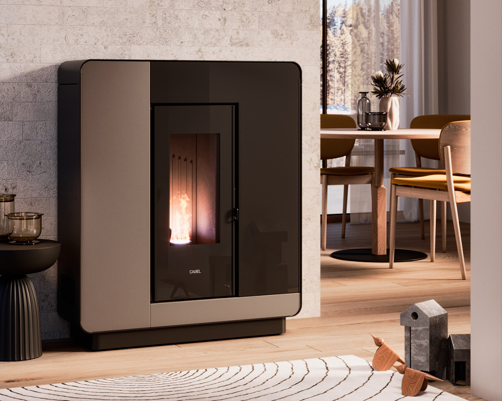 Véritable objet d’ameublement, les poêles ELLE 9 PLUS se déclinent habillés de matières originales. La façade asymétrique est composée d’un panneau en verre noir que vient compléter un panneau en acier (light bronze ou titanium), en pierre (OSSIDO BRUNO OU NERO GRECO) OU EN VERRE NOIR.